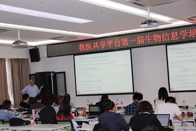 2018年4月23日,由牧医所中心实验室主办,北京智云达公司承办的第一届生物信息学精品培训班正式开班。培训班由牧医所特聘教授、美国俄亥俄州立大学食品农业和环境科学学院Yu Zhongtang教授和王玲玲助理研究员专程授课。于忠堂教授主要从事胃肠道微生物生态及微生物发酵的评价和研究,在生物信息学方面有很深的造诣。王玲玲老师在中国疾病预防控制中心获博士学位,美国俄亥俄州立大学动物科学学院博士后,在微生物宏基因组测序的原理和操作方面具有深厚的基础。