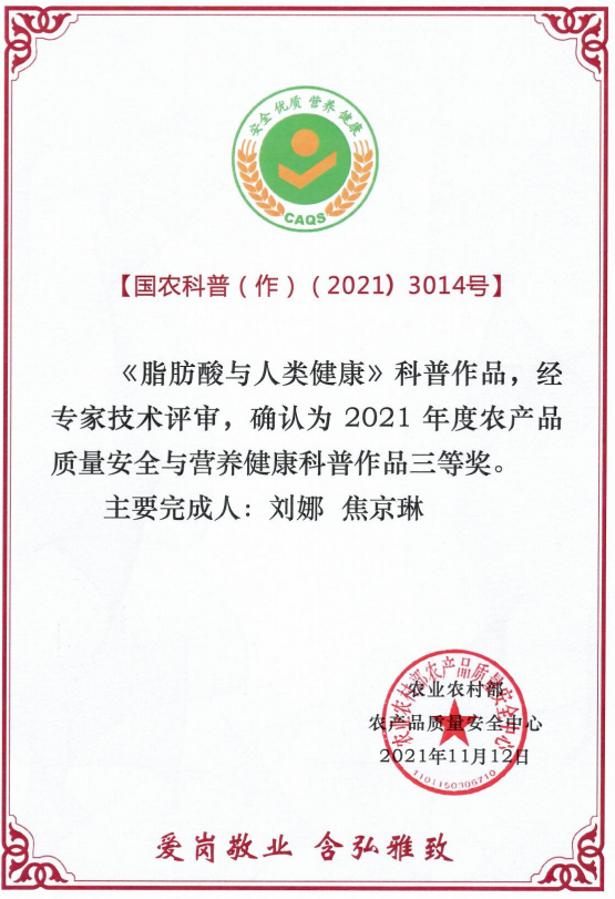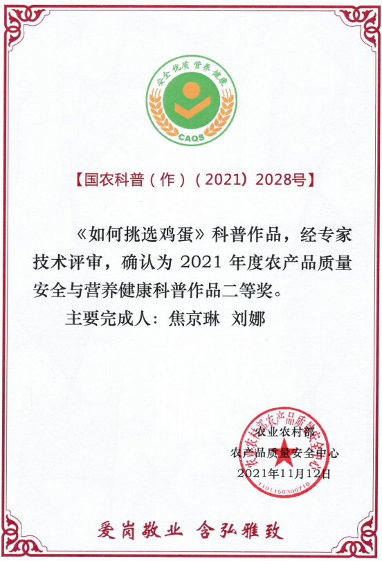 2021年,农业农村部农产品质量安全中心组织了“爱岗敬业 含弘雅致”科普活动,中心实验室组织人员积极参与。近日,农安中心组织专家对2021年度的科普作品进行了技术评审,中心实验室杨悠悠等撰写的《肉的香味原来是这么来的》获得一等奖,刘娜、焦京琳撰写的《如何挑选鸡蛋》和《脂肪酸与人类健康》分获二、三等奖。